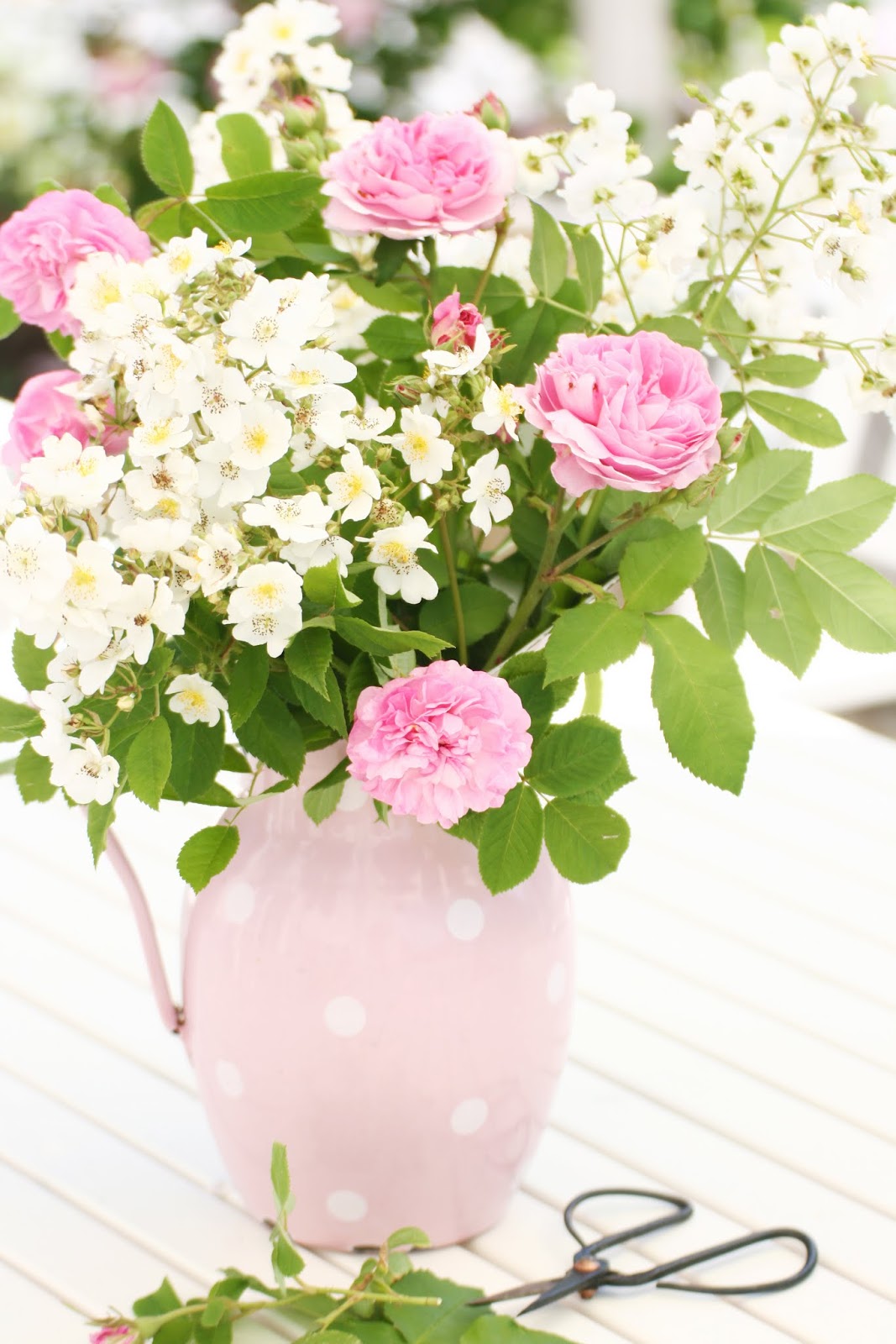 Aber jetzt zu meiner Blumendeko. Ihr erinnert euch an die Multiflora vom letzten Post? Ich habe sie zusammen mit ein paar Zweigen von *Mary Rose* in meiner rosanen Emailkanne arrangiert. Diese Kanne hätte ich bestimmt schon hundertmal verkaufen können. Auf jedem Markt gibt es mindestens einer, der fragt, was sie kostet. Dabei ist sie unbezahlbar, ein Geburtstagsgeschenk vom Schwesterherz vor vielen Jahren und ich liebe sie! ♥