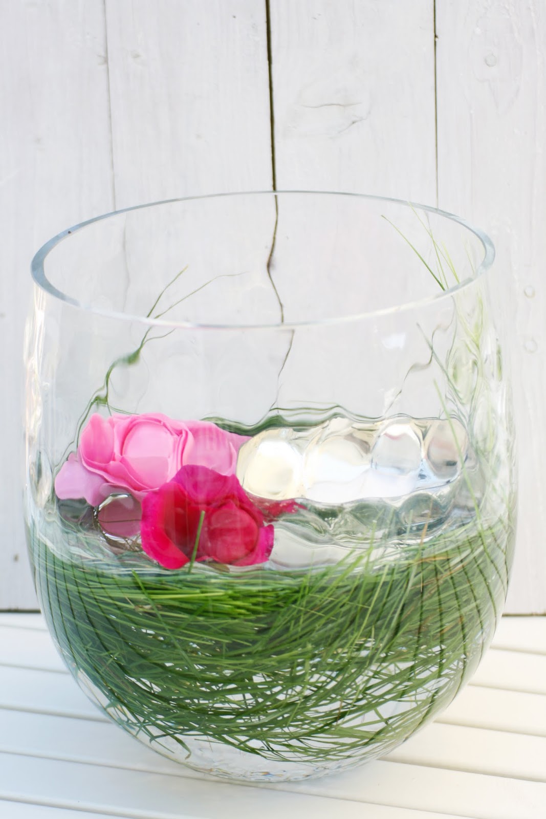 Hier also meine große Vase, die ich mit Seegras, Wasser, Rosen und einem schwimmenden Teelicht aus Bauernsilber aufgepeppt habe.