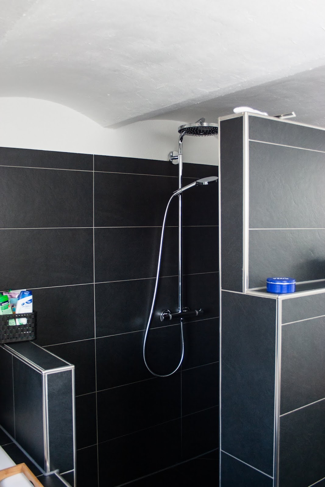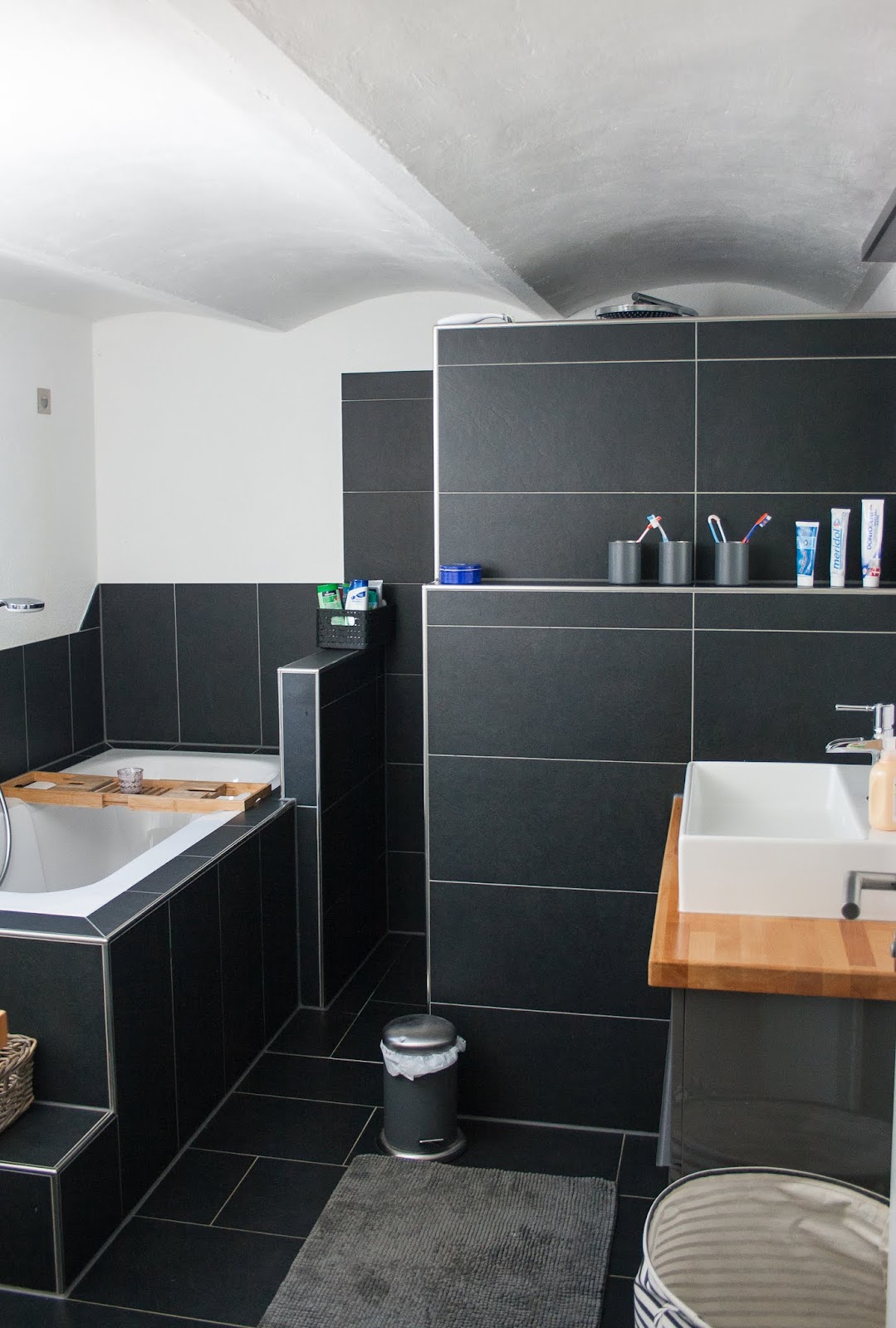 Da die Deckenhöhe hier im Haus relativ niedrig ist und das Bad ganz früher ein Stall war…. deshalb auch das Gewölbe ♥ , würde es zu wuchtig wirken, wenn alles durchgefliest wäre.ich wollte mehr einen wohnlichen Badcharakter. Schwarze Fliesen hatten wir ausgesucht, diese großen Feinsteinzeugfliesen haben uns super gefallen. Glücklicherweise haben wir einen tollen Fliesenleger gefunden, der unsere Ideen richtig klasse umgestzt hat. Die Dusche sollte als einziges komplett gefliest sein… dazu ein niedriger Rand um die Badewanne…..