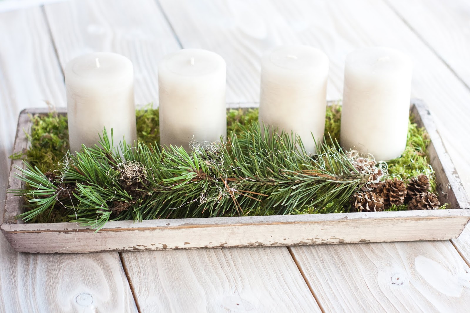 Für die schnelle Variante nehme ich ein Holztablett oder ihr verwendet eine Metallschale. Diese belege ich mit Moos und arrangiere darin die Kerzen