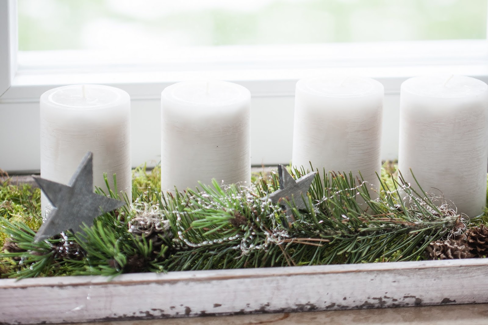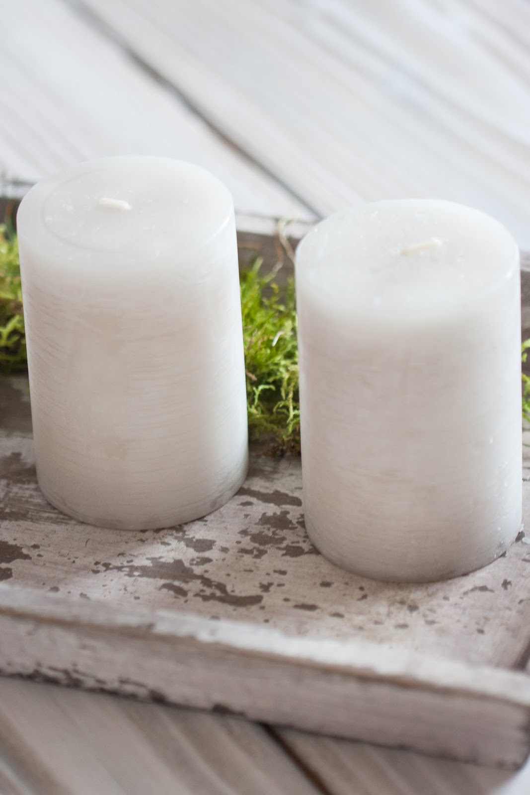 Für die schnelle Variante nehme ich ein Holztablett oder ihr verwendet eine Metallschale. Diese belege ich mit Moos und arrangiere darin die Kerzen