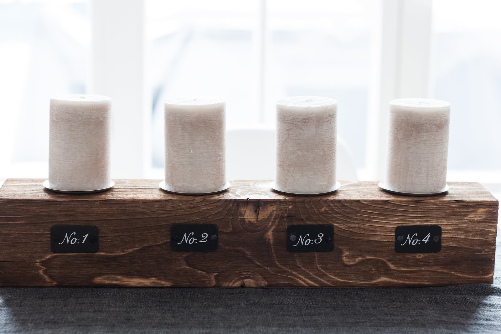 Damit die Kerzen auch halten und das Holz geschützt ist, habe ich vier große Kerzentüllen gekauft und mit einem dünnen Holzbohrer vier Löcher in das Holzstück gebohrt. Ich habe genau abgemessen, damit die Löcher a) auf einer Linie und b) in gleichmäßigem Abstand liegen