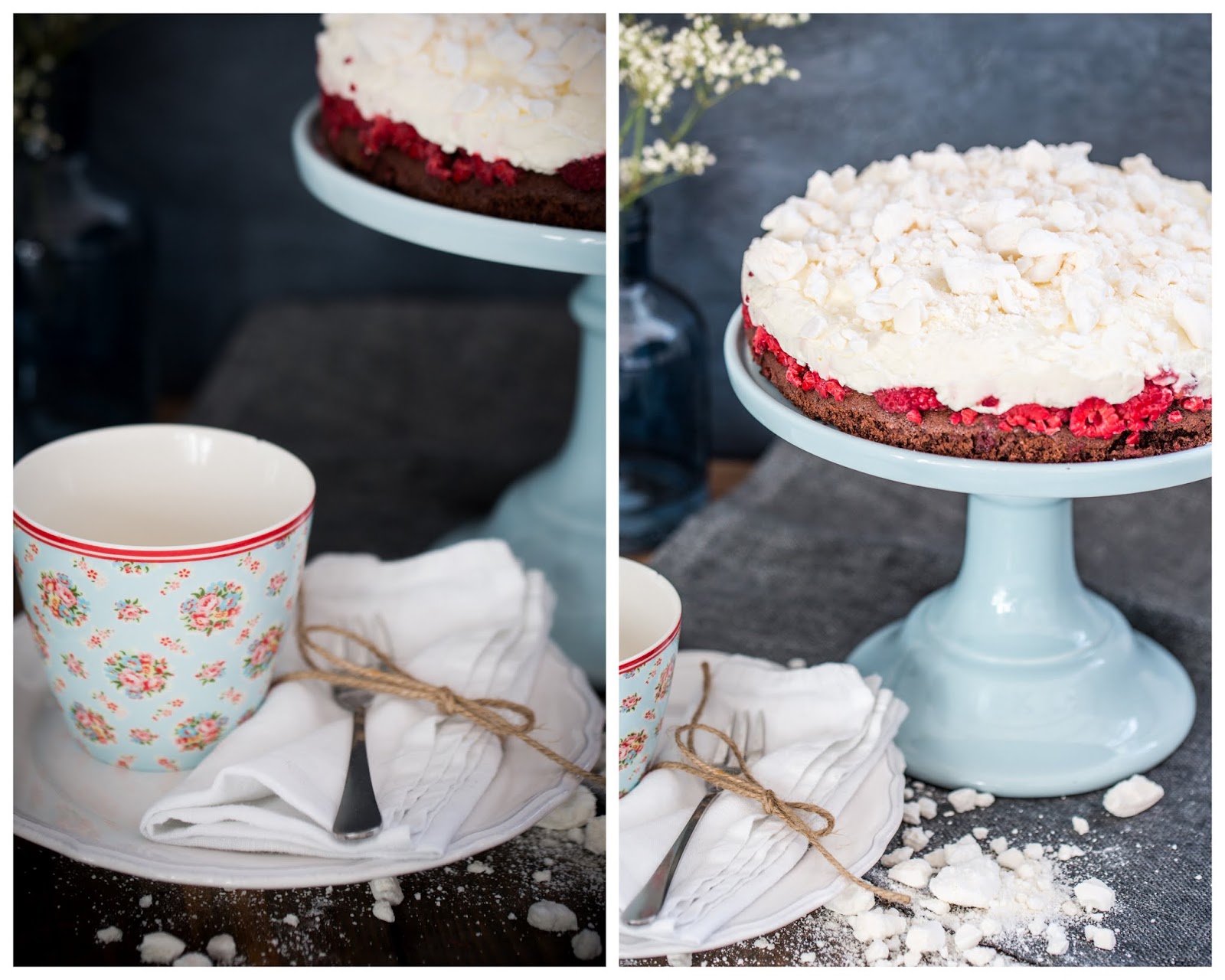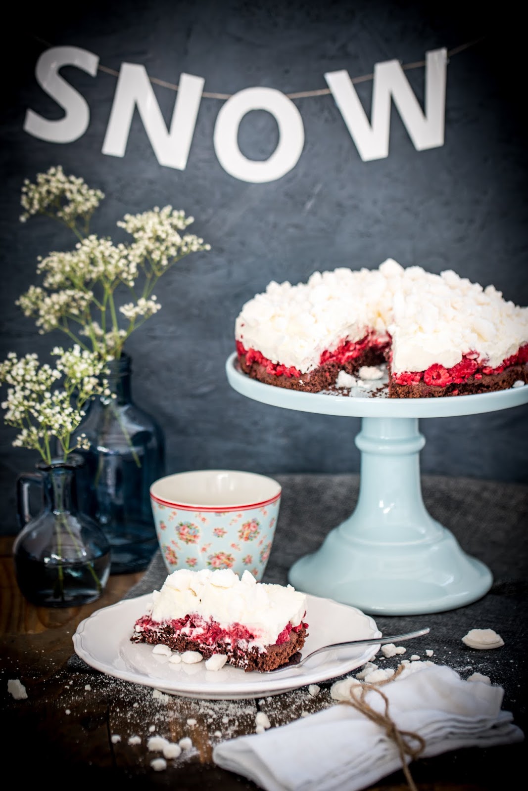 Ein Schokoladen- Blitzbiskuitboden mit Sahne, Himbeeren und als Topping obendrauf Schnee ;))… vielmehr zerbröselte Meringuen…. ♥ Hat sehr sehr lecker geschmeckt und für euch habe ich das Rezept zum Download als PDF ( klick ):)