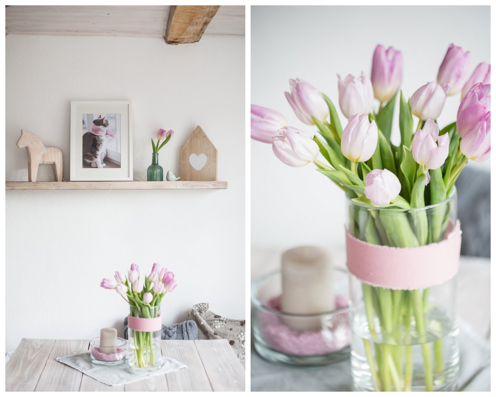 Ihr seht auch hier haben Tulpen Einzug gehalten ♥ Ich kaufe immer 2 Bund davon und verteile sie dann in kleinen Väschen und der Rest kommt in die große Vase auf dem Tisch. Wie freue ich mich wieder an meinem Rosa :))