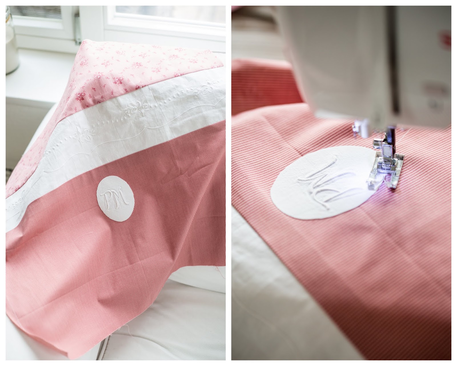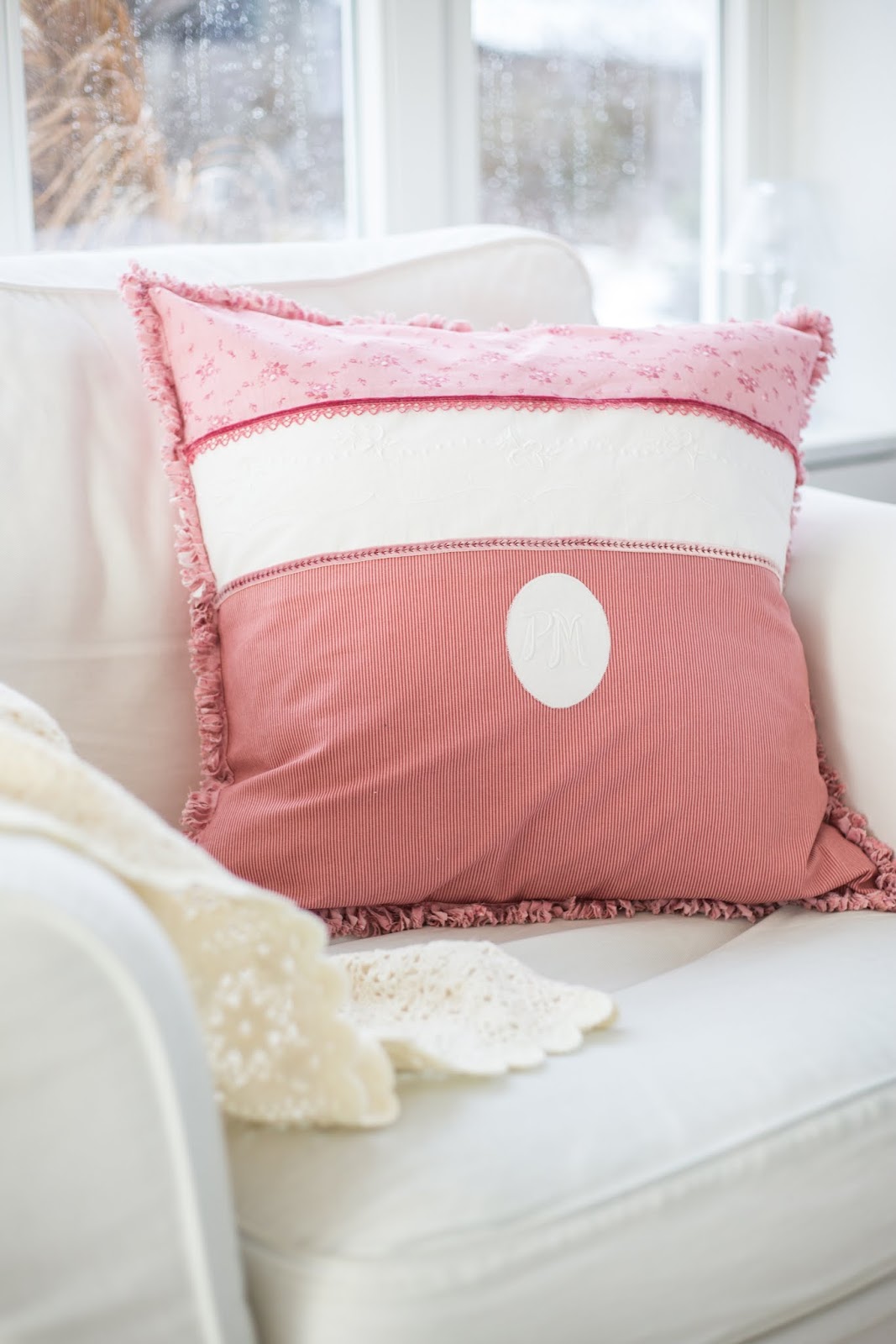 Schon seit einer Weile schlummern diese süßen dänischen Stöffchen, die ich hier in einem kleinen schnuckeligen Stoffgeschäft gekauft hatte, bei mir. Heute habe ich sie endlich zusammen mit einem ganz alten Oberleintuch in Weißstickerei von meiner Oma zu einem Kissen vernäht. Das Monogramm des Leintuchs… PM für Pauline Maier ♥…. habe ich oval ausgeschnitten und appliziert….
