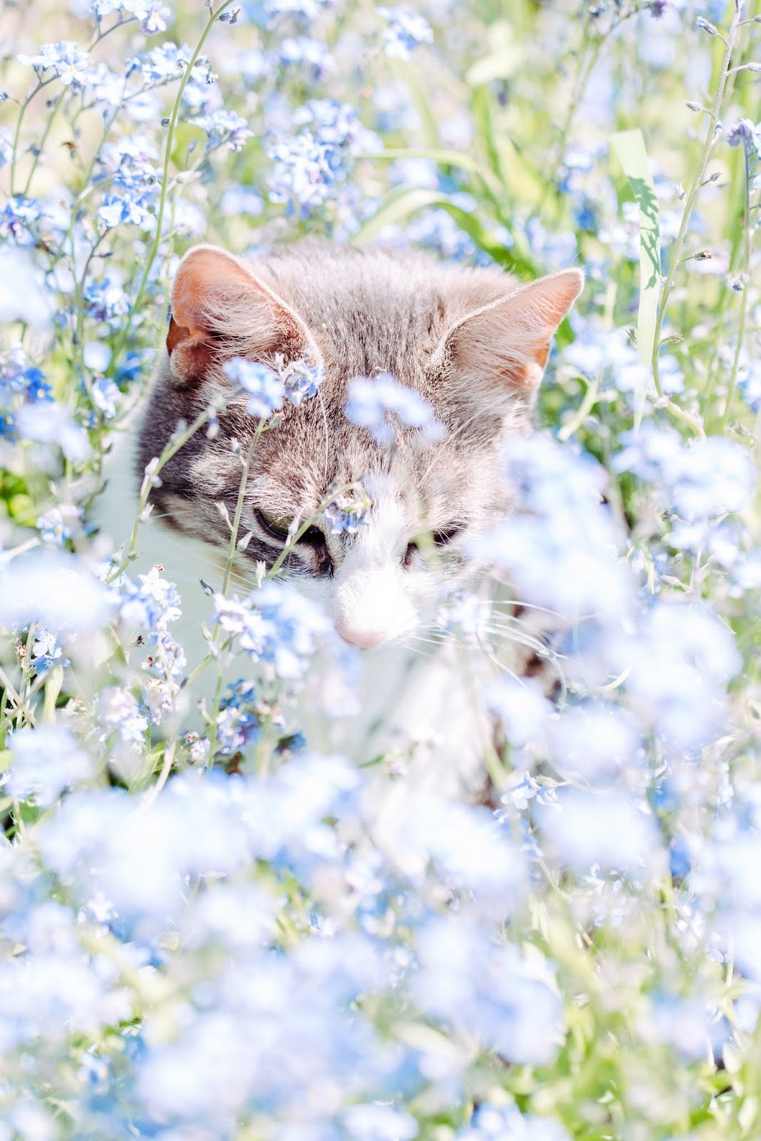 wunderschönes Bild – so richtig romantisch – süßes Kätzchen und Vergißmeinnicht…