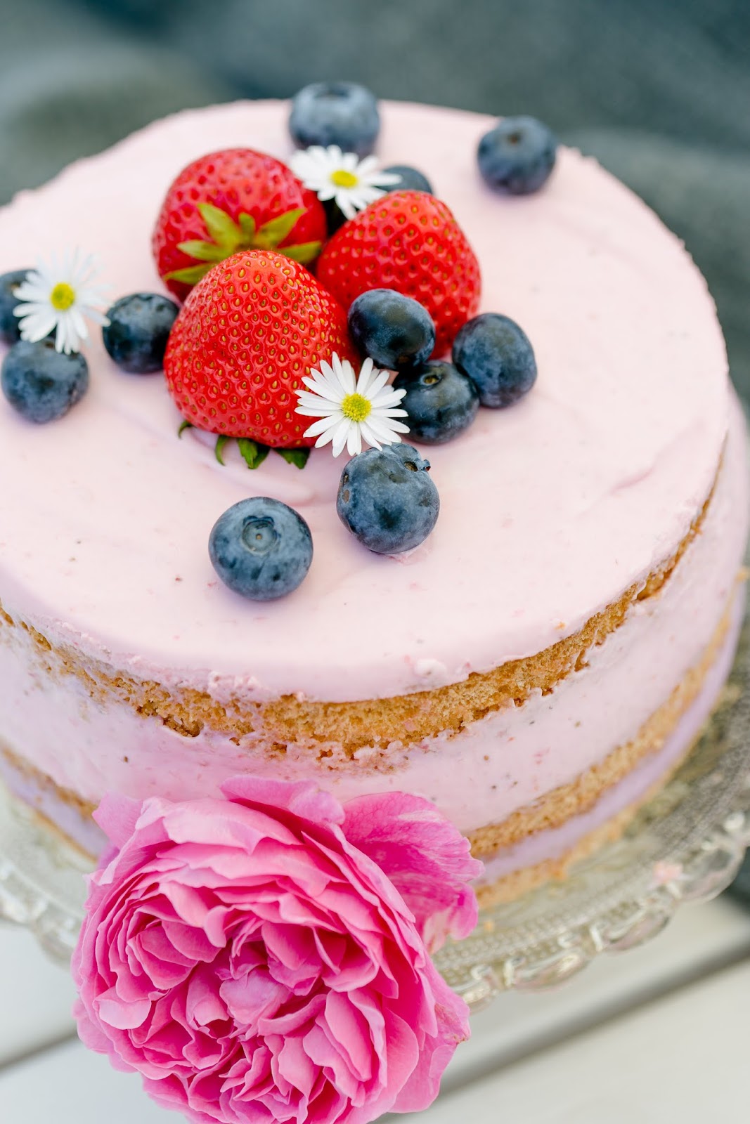 Die Beerentorte besteht aus leckerem Biskuit und einer Creme aus Blaubeer- und Erdbeermus… das gibt die verschiedenfarbigen Schichten! Ich habe die rote Gelatine verwendet, das gibt ein wenig Pep in der Farbe. Außerdem ist sie ein naked cake…. der neuste Trend für alle Hochzeitstortenfans und Backbegeisterte. Die Torten leben optisch vom Wechselspiel zwischen Füllung und
