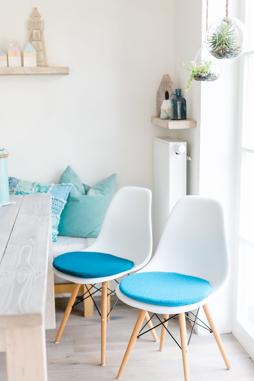 Vor einem Monat, nämlich hier, habe ich euch meine neuen türkisenen Sitzkissen gezeigt,davon habe ich nämlich zwei für mich genäht… Ich finde im Moment die Petrol-/ Türkistöne so schön, einfach sommerlich ♥ Jetzt habe ich den gleichen Stoff in einer Farbnuance heller gefunden, in aqua und meine zwei anderen, nämlich die felligen, auch ausgetauscht. Die sind dann wieder genau richtig für den Herbst ;)) Mir gefällt, dass nicht auf allen Stühlen die gleichen Kissen liegen, sondern zwei in dem dunklen und zwei in dem hellen Türkis. Das halte ich eigentlich immer so….. im Winter hatte ich zwei hellgraue Fell mit dunkelgrauem Wollfleece kombiniert….