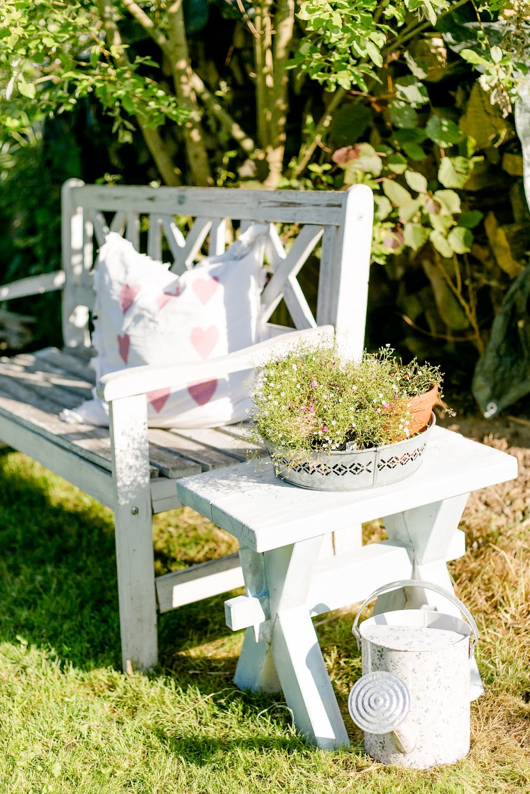 Genau so kann er jetzt bleiben der Sommer….♥ Einfach mal Sonne am Stück, sommerlich warm ohne dass man gleich friert, wenn mal eine Wolke die Sonne bedeckt… obwohl heute gab es mal keine Wolken, juhuuu! 🙂 Nachdem meine Bank vor dem Haus diese Woche so ziemlich den Geist aufgegeben hat und sich quasi nur noch als *Dekobank* eignet, habe ich eine neue bestellt… auch wieder in weiß ♥ Die kam heute morgen mit der Spedition und nach dem Aufbauen war Frau Pomponetti mit dem Aufräumen des Gartenteils beschäftigt, wo die alte Bank nun ihren Platz finden sollte. Da stand nämlich noch eine ganz ganz alte Bank noch aus Birkendorf, die der Wertstoffhof nicht annahm und diverser anderer Gartenmüll, der hier vorher einfach zwischengelagert wurde… ;)) , kennt wahrscheinlich jeder….lach…. Plastiktöpfe, abgeschnittene Zweige und anderer Grünmüll, ich habe kein Bild des Vorherzustandes, sondern nur eins nachher…. :))