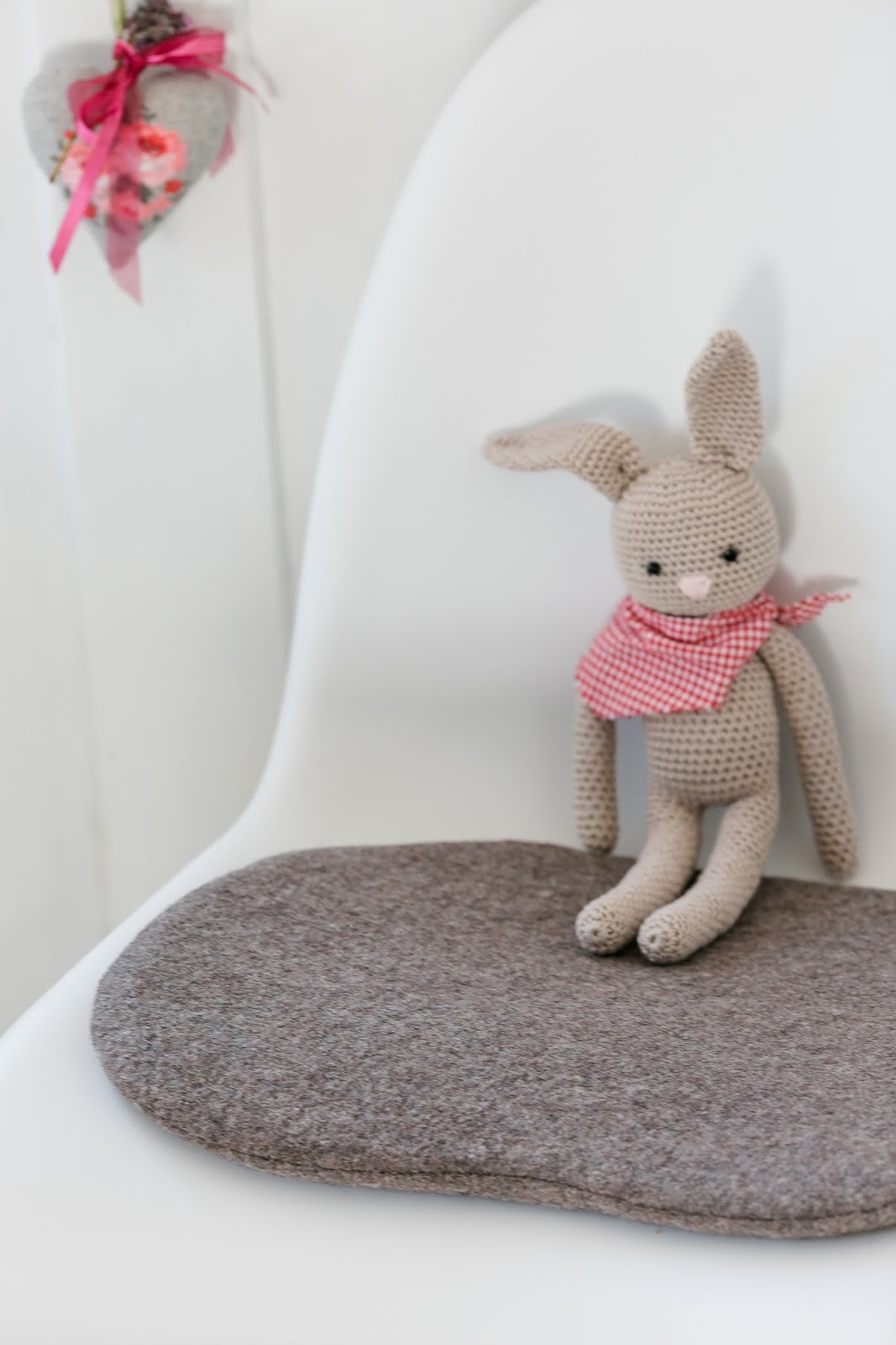 Herausgesucht hat sie sich den taupefarbenen Wollstoff, der auf dem weißen Stuhl toll zur Geltung kommt ♥