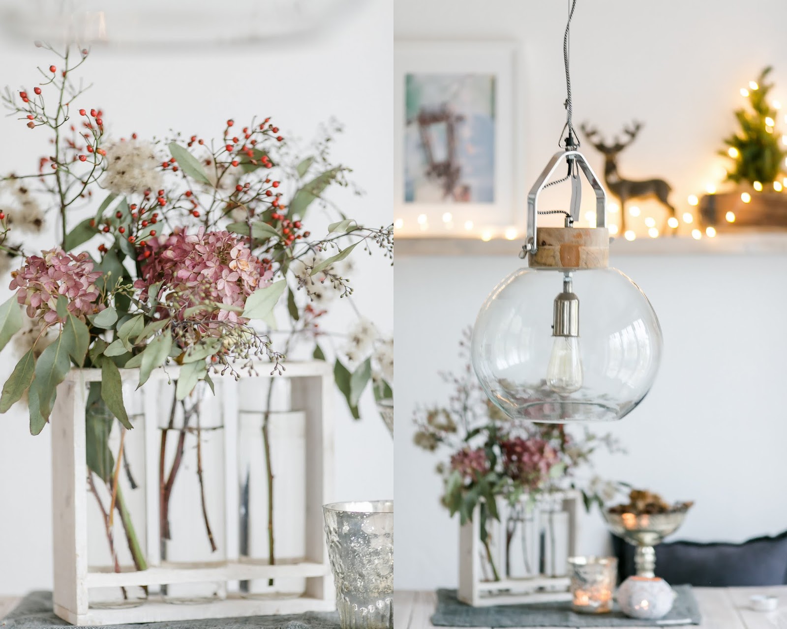 Ich habe die Eukalyptuszweige von letzter Woche zusammen mit Hagebuttenzweigen der *Multiflora* von meiner Mom arrangiert und als I Tüpfelchen einen Zweig der wilden Waldrebe, die ich am Neusiedlersee in den Weinbergen mitgenommen habe ♥