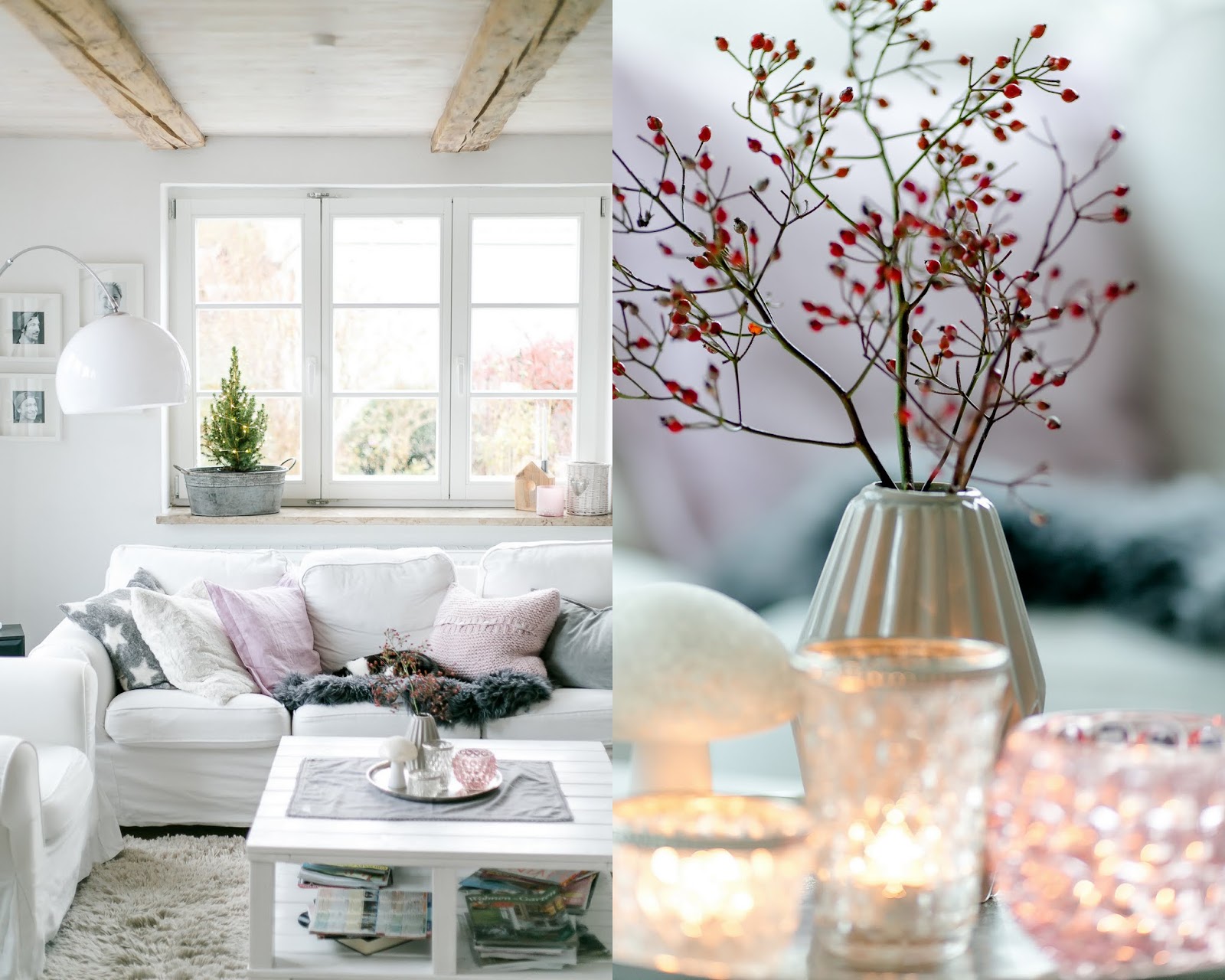 Auch im Wohnzimmer habe ich etwas umdekoriert. Vom Ikea habe ich letztens eine kleine Zuckerhutfichte mitgenommen und gestern hereingeholt. Nun steht sie auf dem Fensterbrett in meiner kleinen Zinkwanne , garniert mit einer Lichterkette und strahlt mit den vielen Teelichtern um die Wette. Auf dem Tisch habe ich auch ein paar Hagebuttenzweige dekoriert. Ich mag dese kleinen Hagebutten sehr gerne ♥