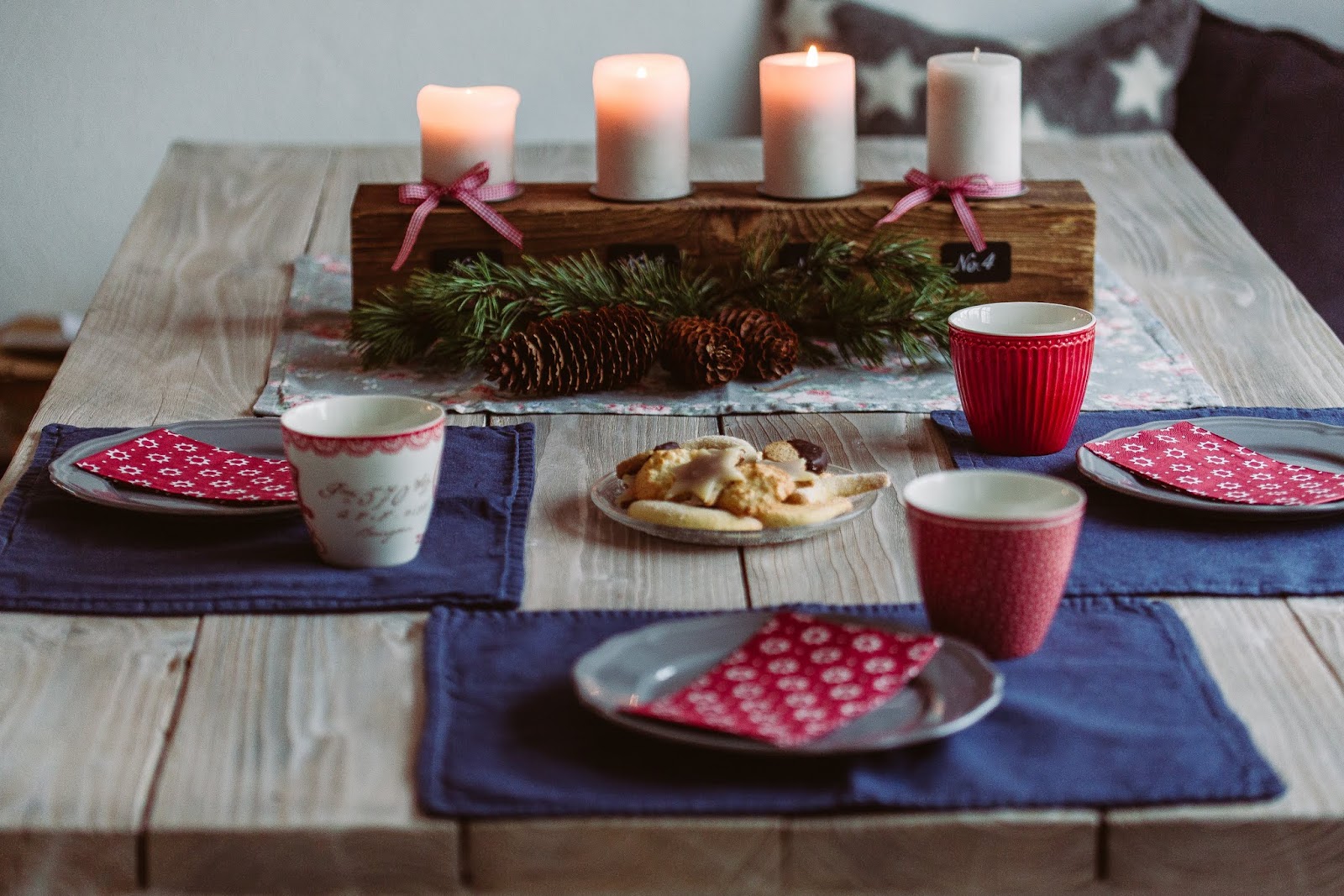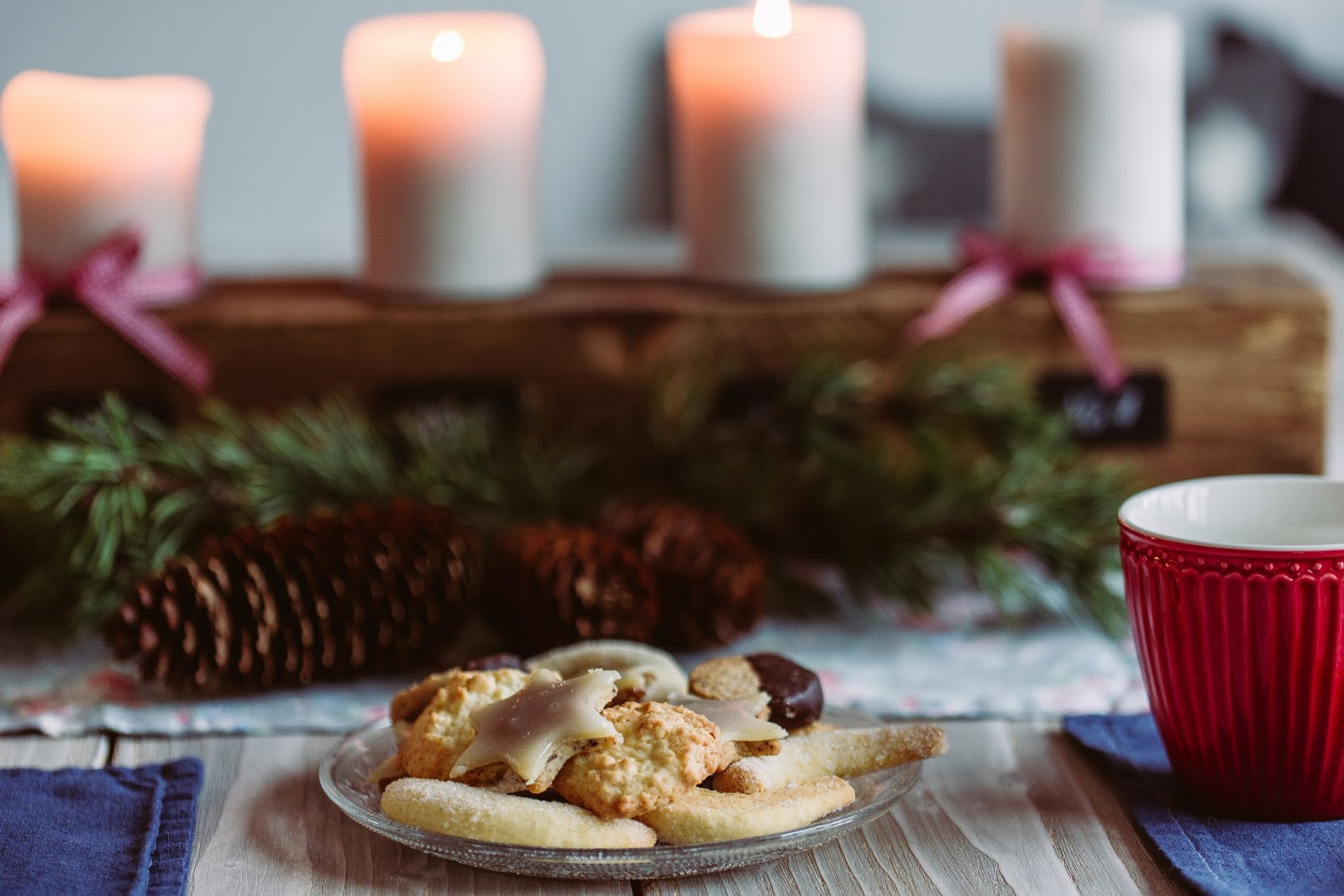 Auf dem Tisch siehst du auch gleich den Plätzchenteller stehen, das Kokosbusserlnrezept gab es hier schon und die Marzipansterne gab es hier schon.