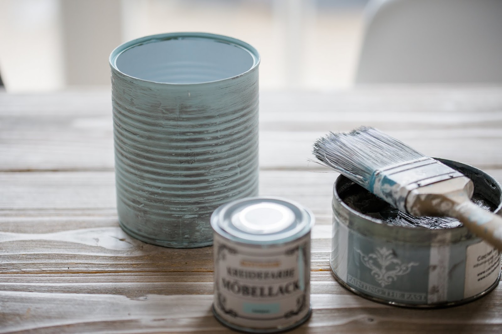 Ich liebe alte Dosen und habe schon viele wiederverarbeitet….. Diese hier ist mit Kalkfarbe lackiert und am Schluss mit *Pastewax* behandelt. Ich habe ein lichtes Türkis als Grundfarbe genommen und habe mit einem dunklen *Pastewax* leicht teilüberpinselt. Dann sofort das Wachs mit einem Spüllappen (heißes Spülwasser!) wieder abreiben….. dabei geht auch wieder Farbe ab und die Dose schimmert durch…. das ergibt diesen Vintagelook. Aber Vorsicht…. nicht übertreiben! ;))