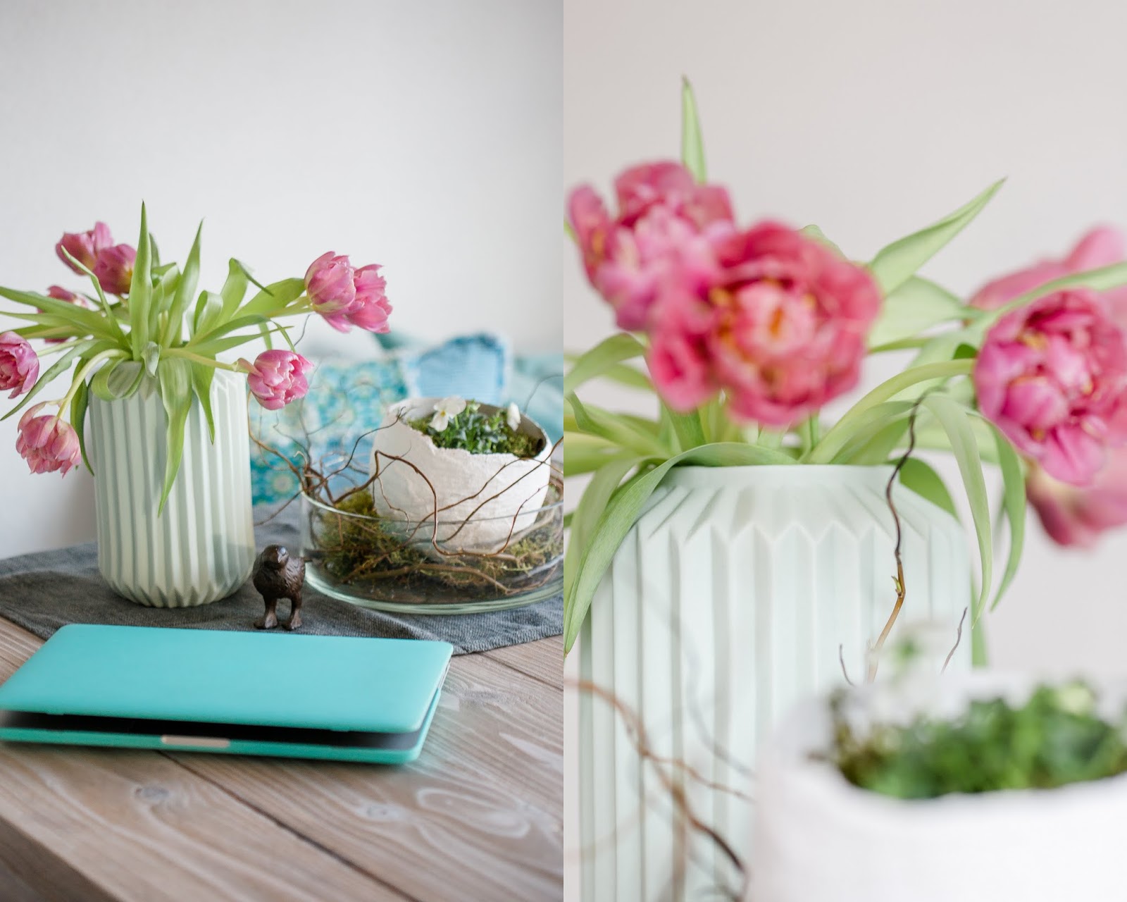 Jetzt aber erst zum Friday Flowerday der bei mir am heutigen Samstag stattfindet….. Meine momentane Lieblingsvase…. uups…. in meiner Lieblingsfarbe Mint ♥…. mit wundervollen gefüllten Tulpen in einem tollen Rosaton ♥