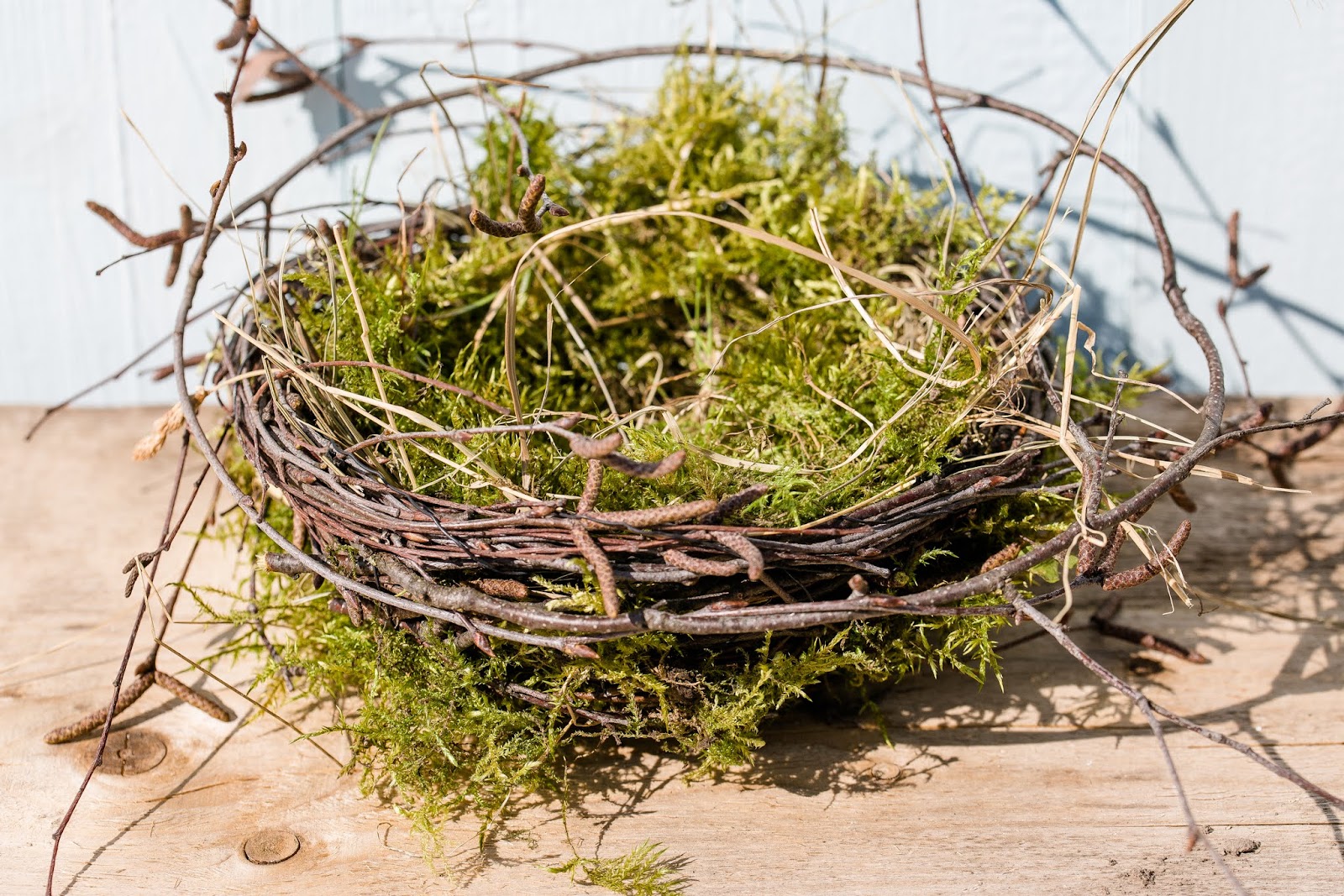 Wenn die gewünschte Größe erreicht ist, mit Heu oder Gras stabilisieren. Danach innen mit Moos polstern und die Zwischenräume außen mit Moos füllen…..