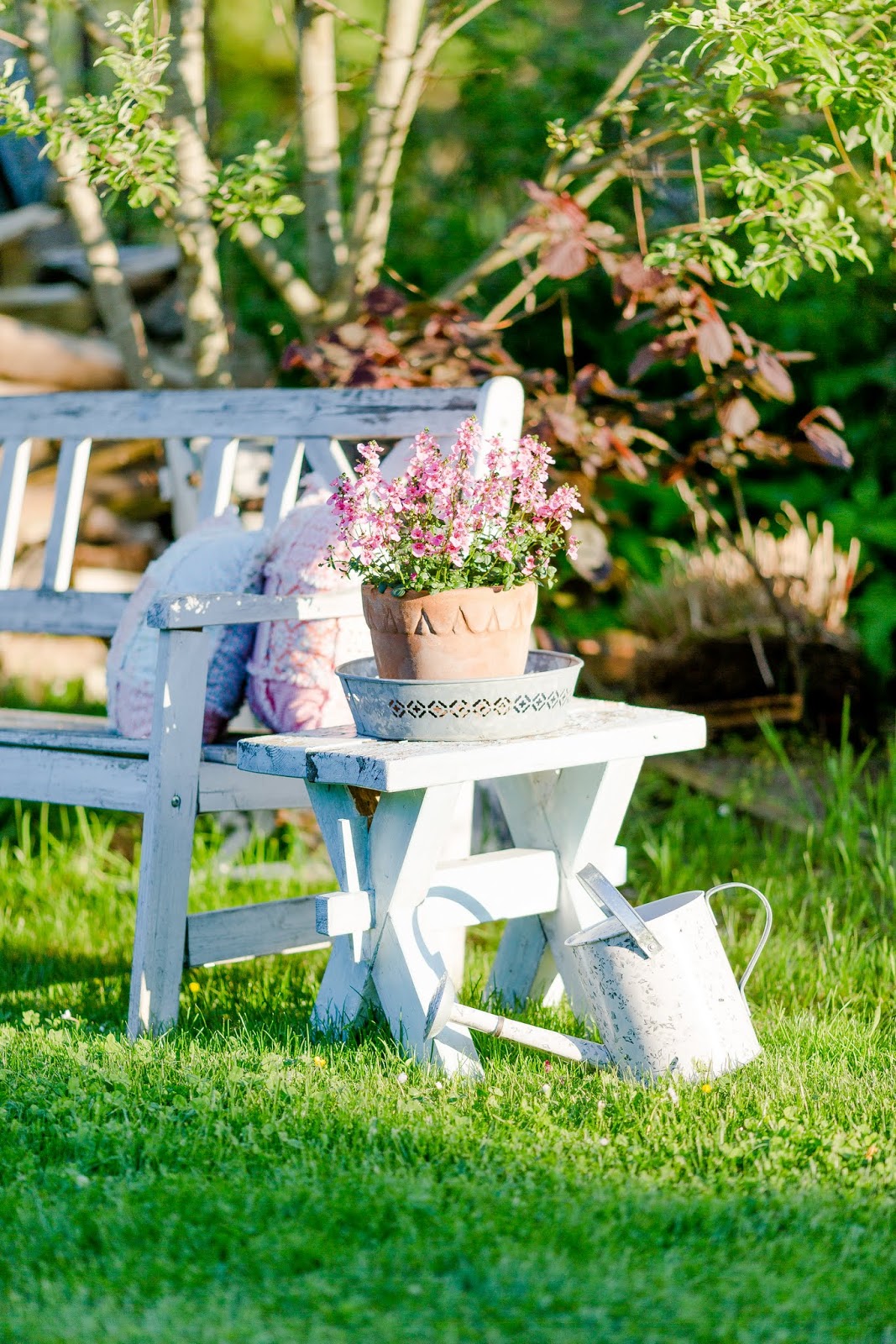 Hast du Lust auf eine Kaffeepause auf der Bank unter der Weide? Da ist es auch schön schattig ;)) Vor allem am Abend, wenn alles golden schimmert ist das ein wunderbarer Platz ♥