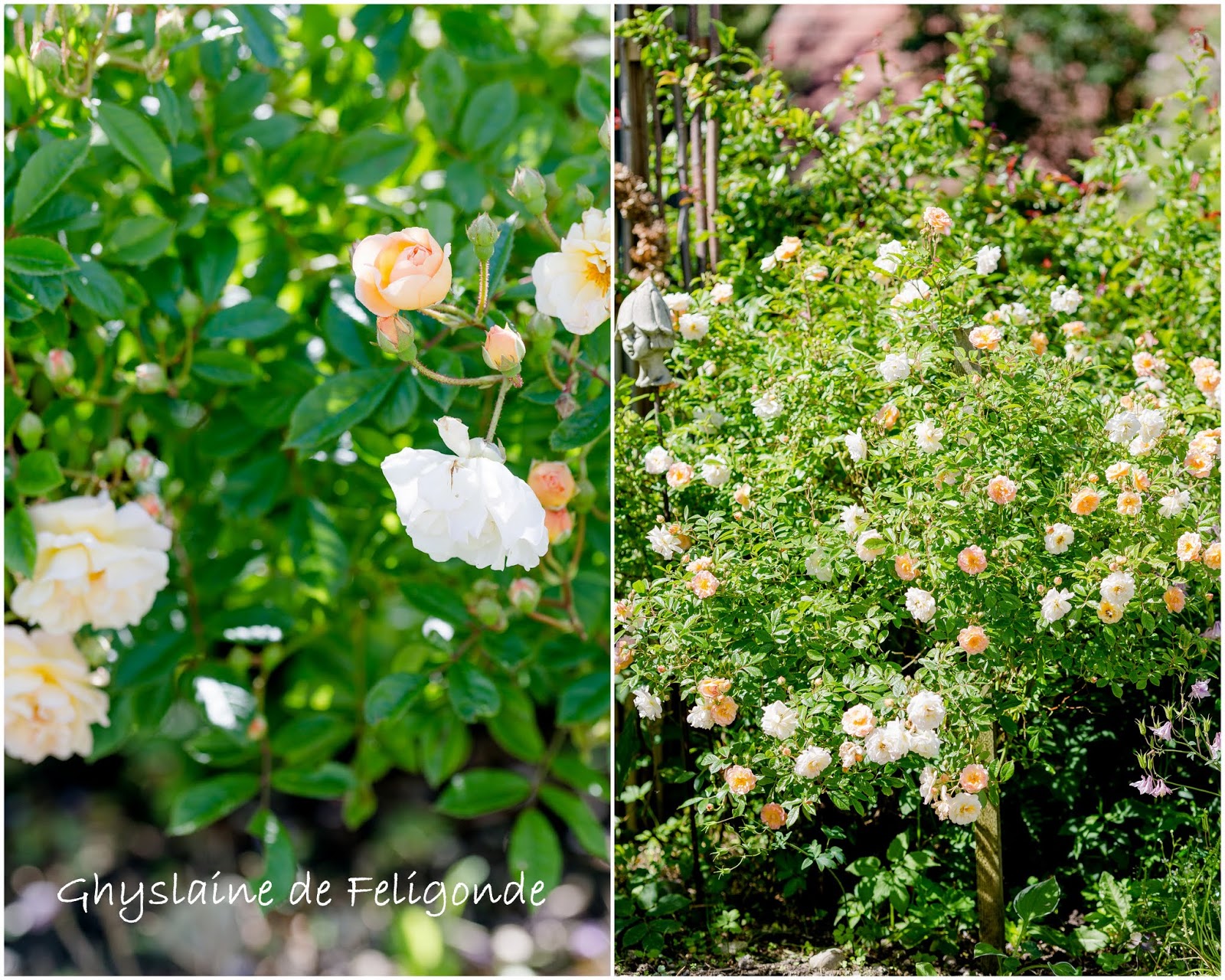 Fast daneben steht die Ghyslaine de Felogonde. Ich habe sie als Strauchrose im Garten, aber sie kann auch als kleiner Rambler an Rosenbögen hochwachsen. Als Strauchrose wird sie etwa 2 Meter hoch und breit, als Kletterer 3-4 Meter hoch.Ich liebe diese Rose, obwohl sie anfangs einen aprikotfarenen Ton hat ;)) Dann wird sie rosa und im Abblühen fast weiß bis hellgelb. Diese sehr alte Rose hat kleine, moschusartig duftende Blüten, welche in Büscheln zu 6–12 Blüten erscheinen. Sie blüht mehrmals im Jahr, legt aber dazwischen eine deutliche Blühpause ein 🙂