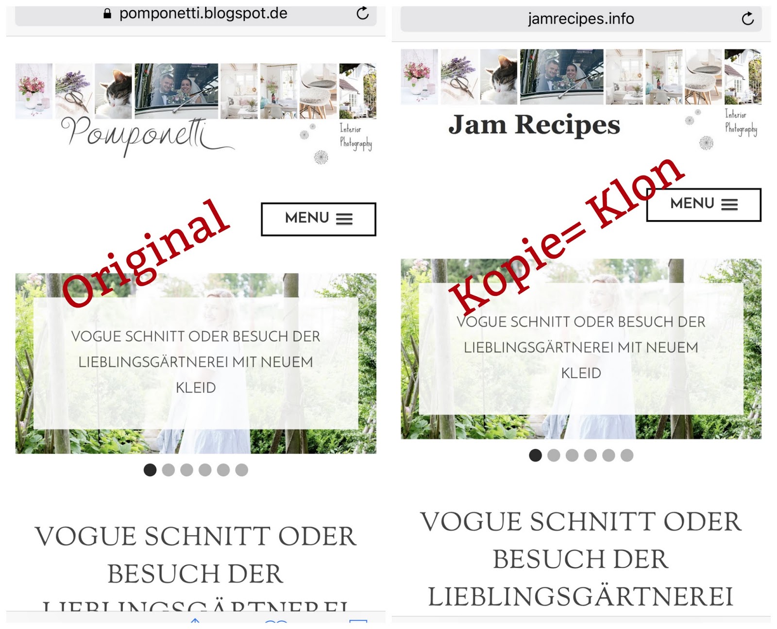 Das heißt mein ganzer Kontent…. Bilder und Posts…. erscheinen 1:1 auf dieser Seite. Das Einzige, was auf eben dieser Seite fehlt, sind ein paar Bloggergadgets, wie die ganzen Follower, meine Blogroll und oben im Menü mein Etsyshop und mein Fotoequipment. Im Impressum ist eine Melanie H aus Hamburg angegeben, was natürlich auch Fake ist, denn mein Klonbetreiber sitzt in Süamerika….. absoluter Horror!! Natürlich konnte ich die ganze Nacht nicht schlafen und habe mich heute morgen nun schlau gemacht…..